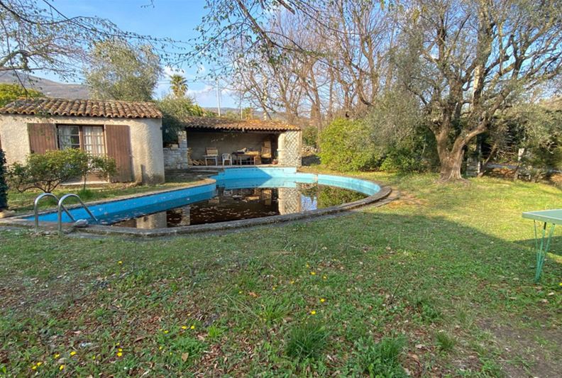 Entre VENCE et le village de TOURRETTES SUR LOUP, dans un quartier résidentiel et au calme, Villa de style provençal, comprenant : - au rez-de-jardin : hall d'entrée, salle de séjour avec cheminée donnant sur terrasse au Sud, cuisine indépendante, chambre principale avec salle de bains et w-c, - en demi-niveaux : deux autres chambres, salle d'eau/ w-c et grande pièce de rangement, - à l'étage : chambre (4) et espace bureau. Piscine, pool-house bénéficiant d'une cuisine d'été, d'une chambre et d'une salle d'eau. Abri couvert 2 véhicules, l'ensemble sur un terrain complanté en partie plat d'environ 1600 m². Travaux de rénovation à prévoir.
