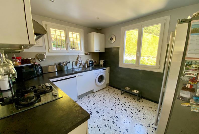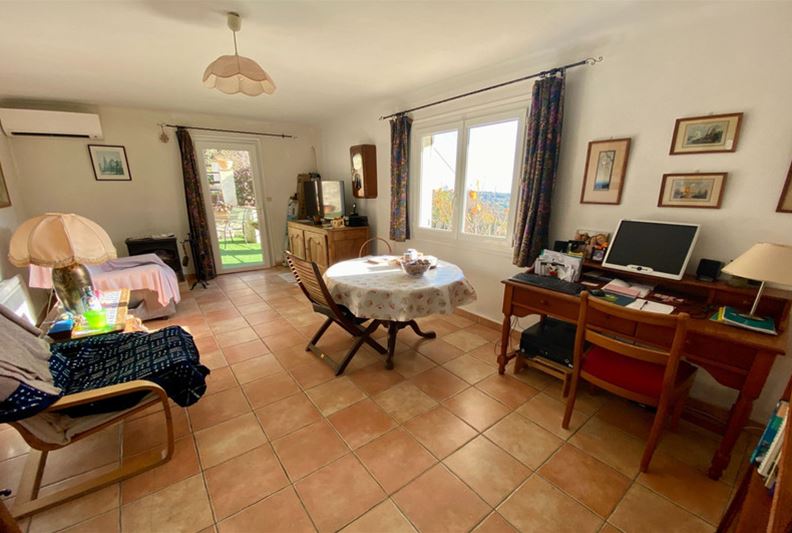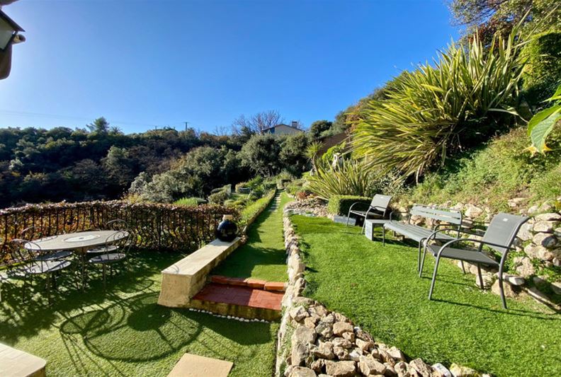 TOURRETTES SUR LOUP, à la sortie de VENCE, dotée d'une belle vue dominante sur les collines environnantes et la mer, Agréable villa divisée en deux appartements, exposée plein Sud : - à l'étage : appartement de 3 pièces, cuisine indépendante équipée, salle d'eau, w-c, balcon et accès à une partie du jardin joliment aménagé en restanques, - au rez-de-jardin : un appartement de 2 pièces, cuisine équipée, salle d'eau/ w-c et terrasse. Une pièce attenante pouvant servir de 2ème chambre à cet appartement, actuellement aménagée en studio de musique. Trois places de stationnement, l'ensemble sur un terrain paysager de 2105 m² offrant divers espaces et terrasses séduisants.