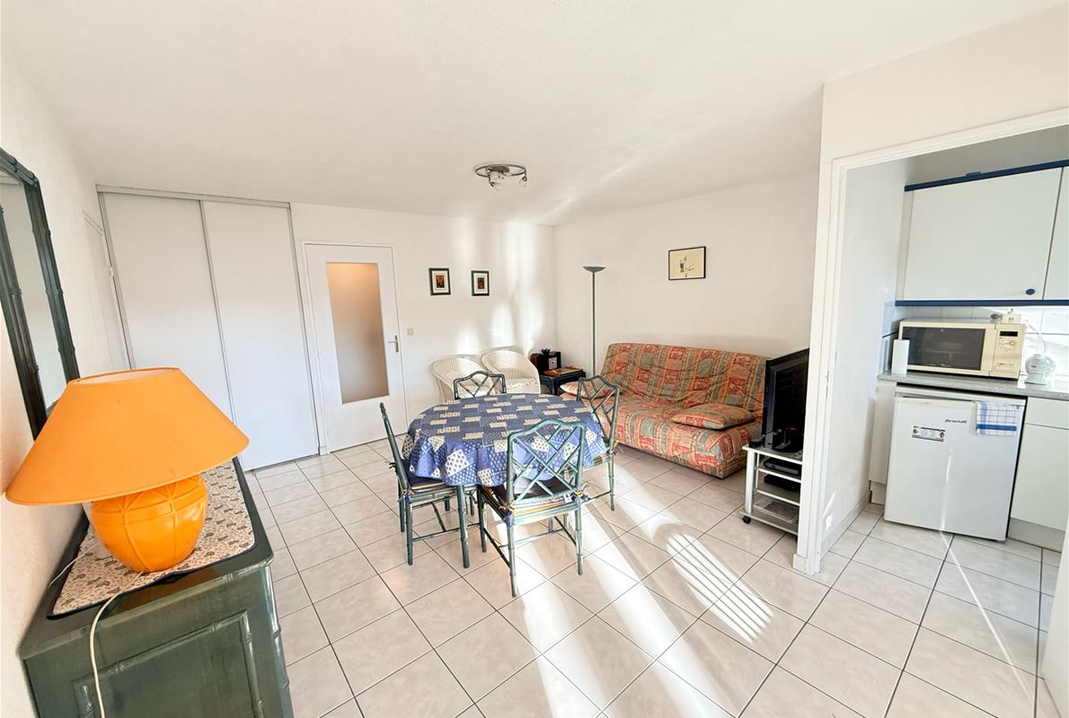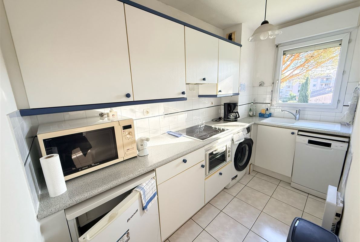 Dans résidence sécurisée avec tennis et piscine, appartement deux pièces d'environ 45,42m2 composé d'une entrée, un WC indépendant, un séjour avec placard, une cuisine équipée indépendante, un coin nuit : Placard, salle de bains avec placard, chambre avec placard. Terrasse sud. Cave. Parking privatif. Possibilité garage en sus (25.000 €)