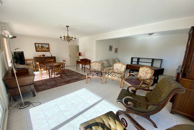 VENCE, centre-ville, dans une résidence de standing avec piscine, tennis et gardien, spacieux appartement, comprenant quatre pièces principales transformé en trois pièces : entrée, vaste double séjour d'angle, cuisine indépendante équipée, belle chambre avec sa salle d'eau/ w-c, et une seconde chambre, salle de bains, w-c et nombreux placards. Vaste terrasse d'angle et double garage de 30 m².