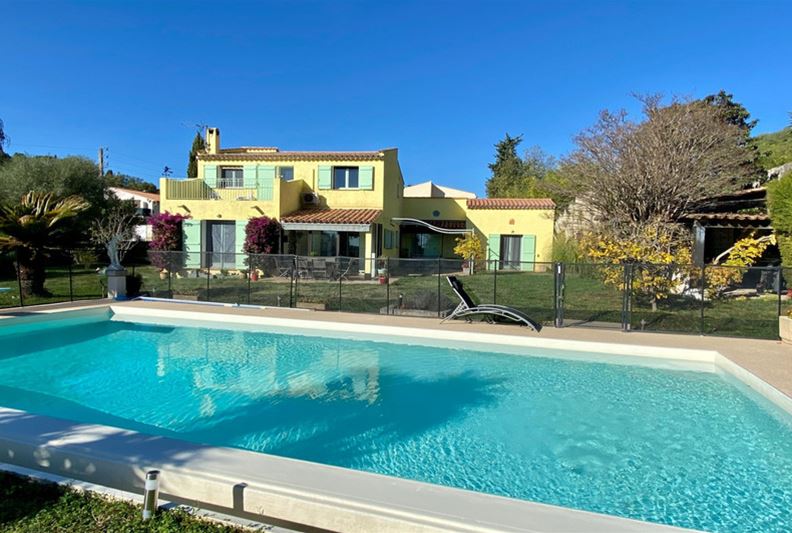 Au sud de VENCE, au calme, parfaitement exposée au Sud, Agréable villa offrant une vie en partie de plain-pied, comprenant hall d'entrée avec placards et w-c indépendant, salon avec cheminée, salle à manger donnant sur véranda, cuisine équipée indépendante entièrement rénovée, une grande chambre avec placard, chambre (2) avec espace mezzanine, salle d'eau, w-c. A l'étage : grande chambre (3) avec placards donnant sur une belle terrasse offrant une vue dégagée jusqu'à la mer, chambre (4) avec placards, salle de bains et w-c. Superbe piscine à débordement de 10x5 m avec belle plage dallée, terrasse couverte, parkings, cave, abri jardin, l'ensemble sur un terrain plat complanté d'environ 1511 m².