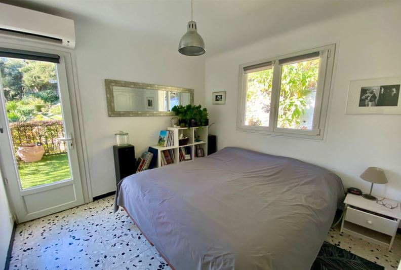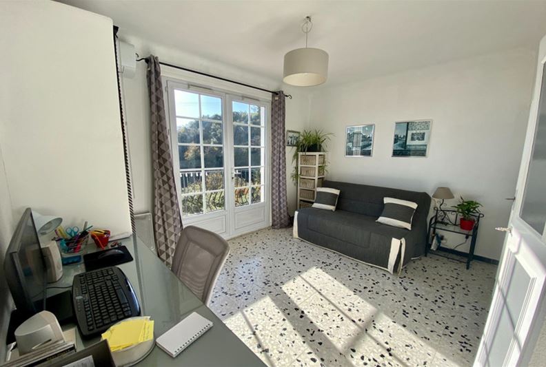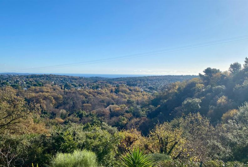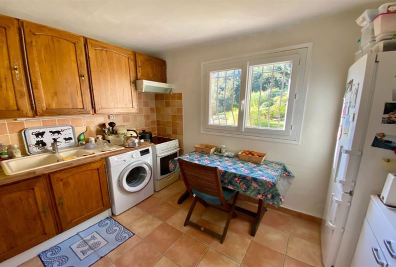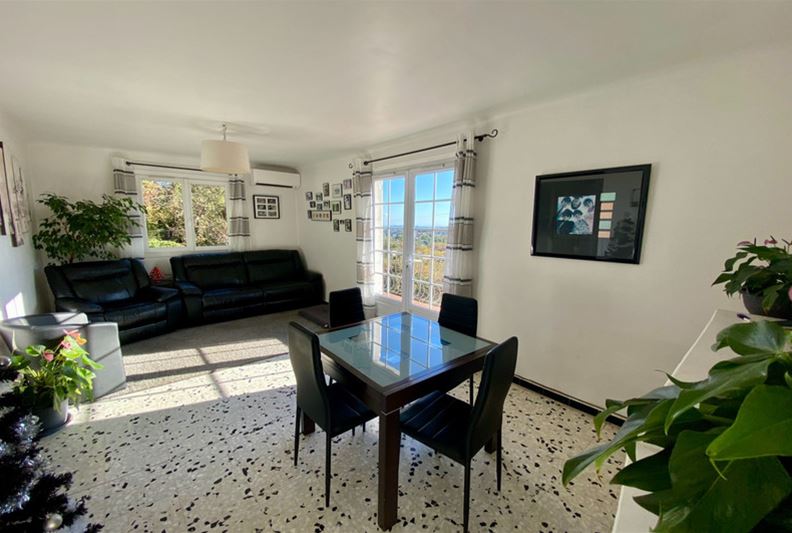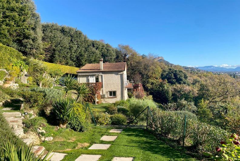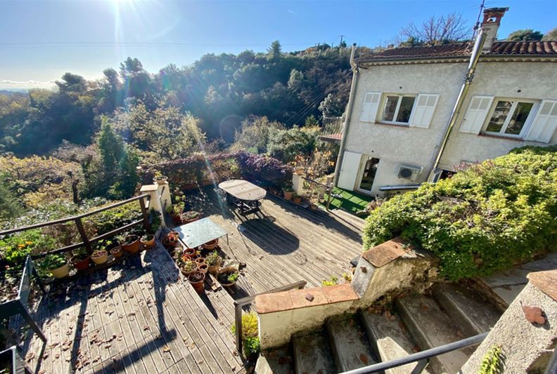 TOURRETTES SUR LOUP, à la sortie de VENCE, dotée d'une belle vue dominante sur les collines environnantes et la mer, Agréable villa divisée en deux appartements, exposée plein Sud : - à l'étage : appartement de 3 pièces, cuisine indépendante équipée, salle d'eau, w-c, balcon et accès à une partie du jardin joliment aménagé en restanques, - au rez-de-jardin : un appartement de 2 pièces, cuisine équipée, salle d'eau/ w-c et terrasse. Une pièce attenante pouvant servir de 2ème chambre à cet appartement, actuellement aménagée en studio de musique. Trois places de stationnement, l'ensemble sur un terrain paysager de 2105 m² offrant divers espaces et terrasses séduisants.