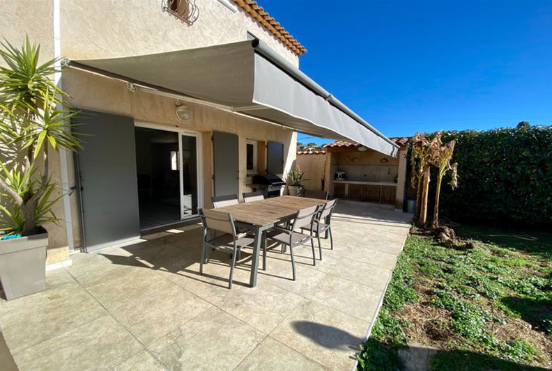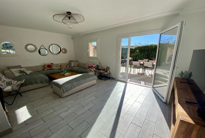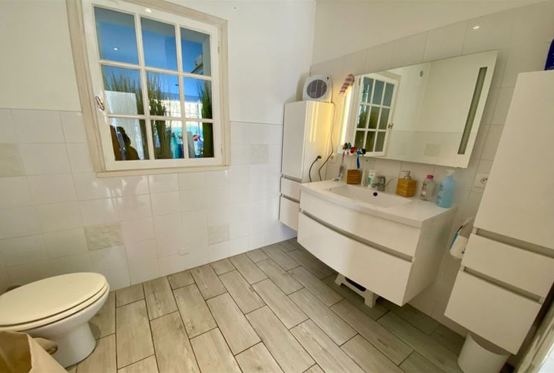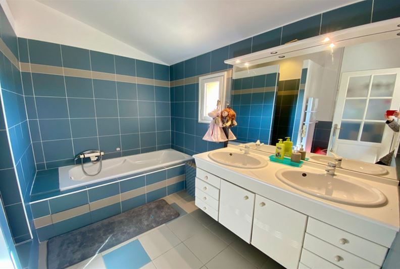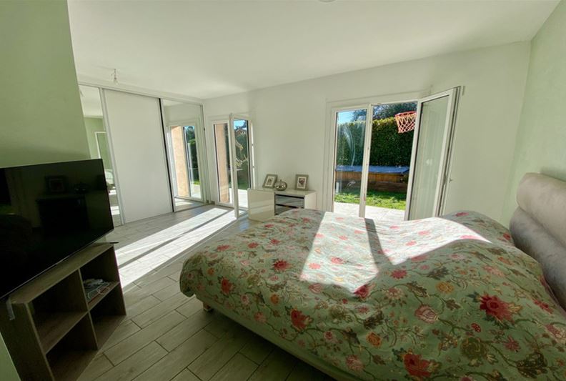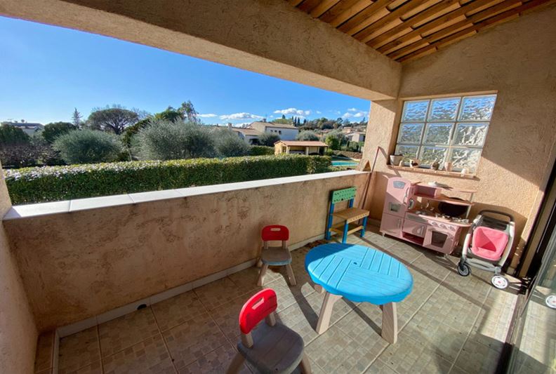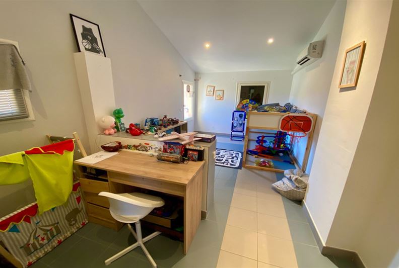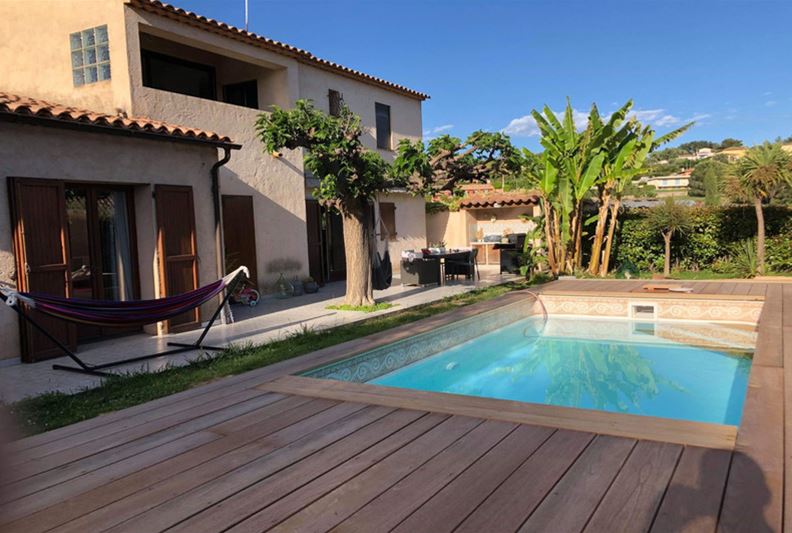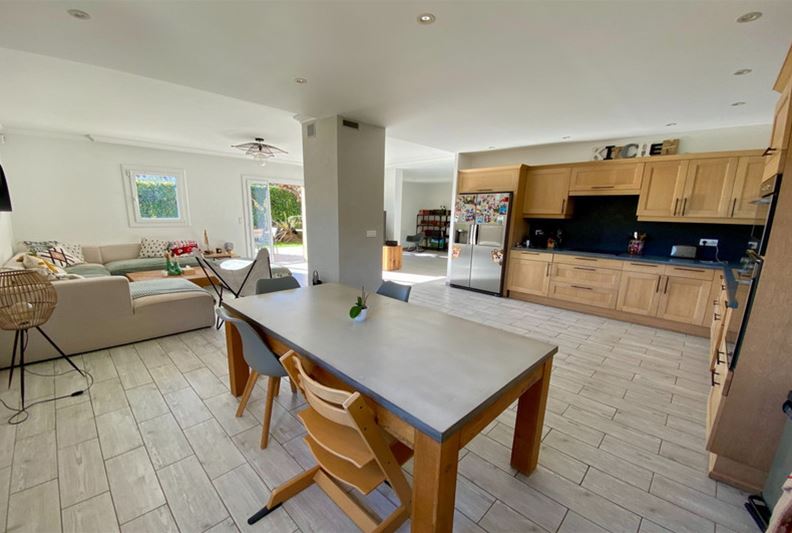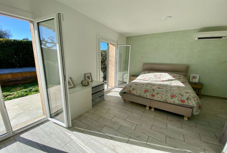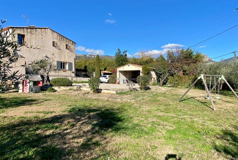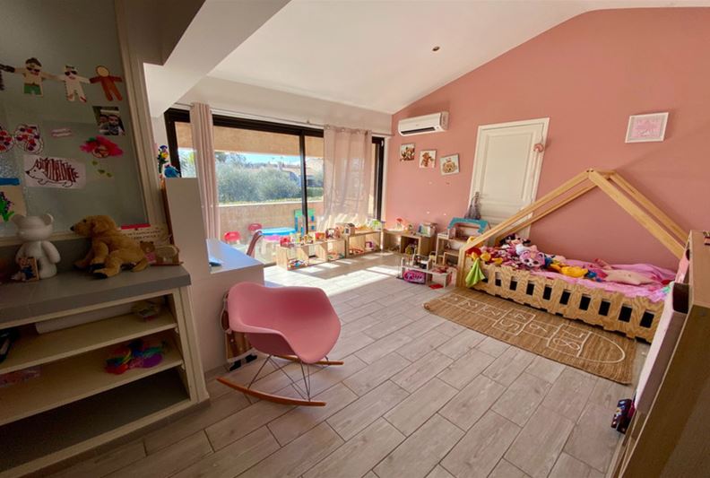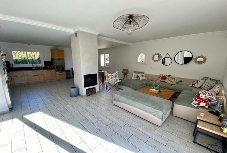 Au Sud de Vence, dans un environnement campagne et à proximité des écoles, Agréable villa familiale, comprenant de plain-pied : hall d'entrée avec placards, salle de séjour doté d'un poêle à bois, cuisine équipée ouverte, grande chambre parente de 25 m² avec placards, chambre (2) avec placards, espace bureau ouvert, salle d'eau/ w-c, w-c indépendant et grande buanderie/ cellier ; A l'étage : grande chambre (3) avec salle de bains complète attenante, placards et donnant sur une loggia, chambre (4) avec salle d'eau, w-c indépendant et placards. Belle terrasse au Sud, piscine semi-enterrée récente, garage, nombreux stationnements, l'ensemble sur un terrain complanté d'oliviers et fruitiers de 1554 m².