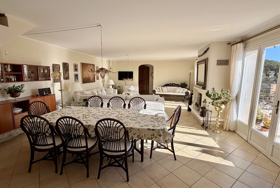 Très jolie villa traditionnelle construite en 2002, offrant environ 160 m² habitables auxquels s’ajoutent plusieurs annexes. Implantée sur un magnifique terrain clos de 2 490 m² aménagé en restanques. Elle comprend au rez-de-chaussée : Porche d’entrée, hall avec placards et WC invités, spacieux séjour lumineux avec cheminée insert ouvrant sur une agréable terrasse, cuisine équipée avec accès à une terrasse couverte, cellier. Une suite parentale avec dressing et salle de bains comprenant balnéo, douche et WC complète ce niveau. À l’étage : Une chambre avec placards et salle d’eau avec douche et WC, Une seconde chambre avec placards, un bureau ou 4eme chambre, une salle d’eau avec douche et WC, ainsi qu’un dressing.